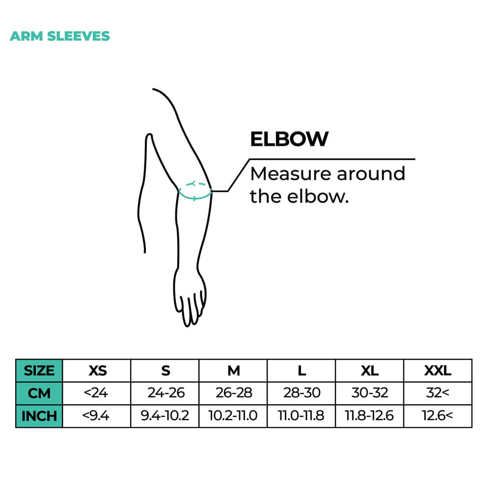 Măsoară circumferința brațului în zona cotului cu o bandă metrică și compară cu tabelul de mărimi: S (24–26 cm), M (26–28