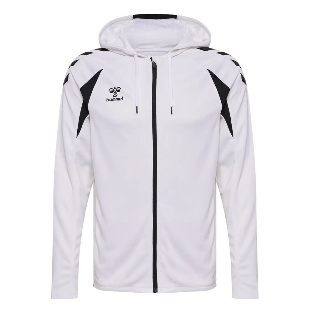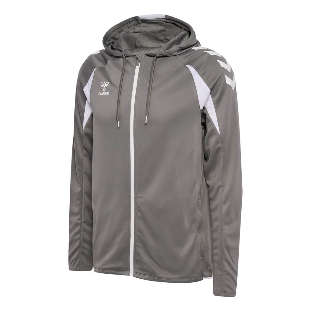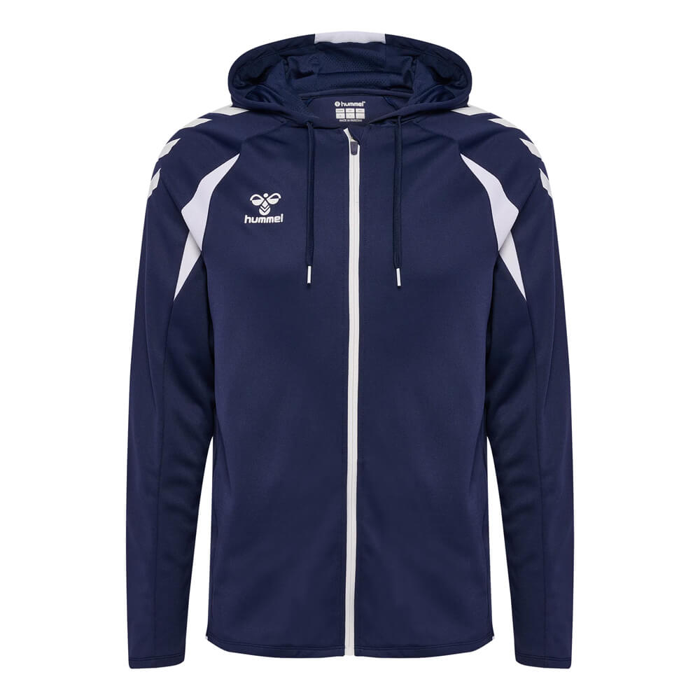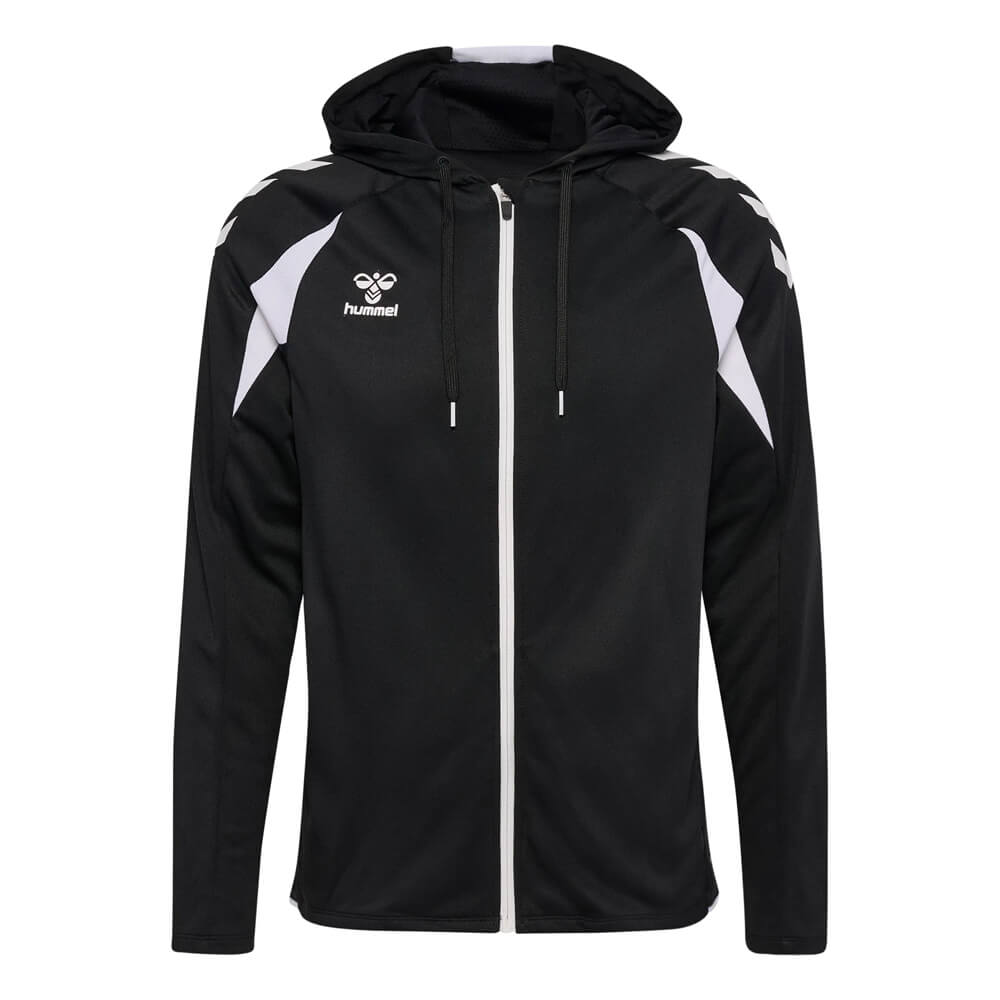 Materialul din poliester evacuează transpirația eficient, menținând corpul uscat pe toată durata antrenamentului. Fermoarul complet pe toată lungimea îți permite să reglezi temperatura instant, fără a fi nevoit să-l scoți. Buzunarele laterale cu fermoar sunt practice — obiectele personale rămân în siguranță în timpul oricărei activități. Logo-ul Hummel cusut pe față și pe mânecă adaugă un detaliu sportiv discret, dar distinctiv.