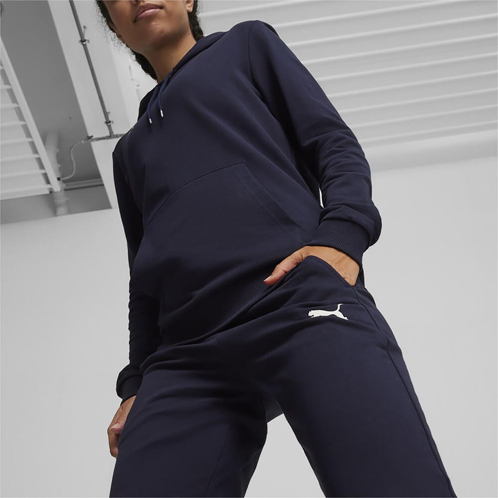 Hanoracul are fermoar integral, gluga cu snur de ajustare si buzunar tip cangur. Pantalonii au croiala Slim Fit, talie elastica cu cordon interior si mansete riflate la glezna. Ambele piese au logo-ul Puma Cat brodat, semn al calitatii si atentiei la detalii specifice brandului.